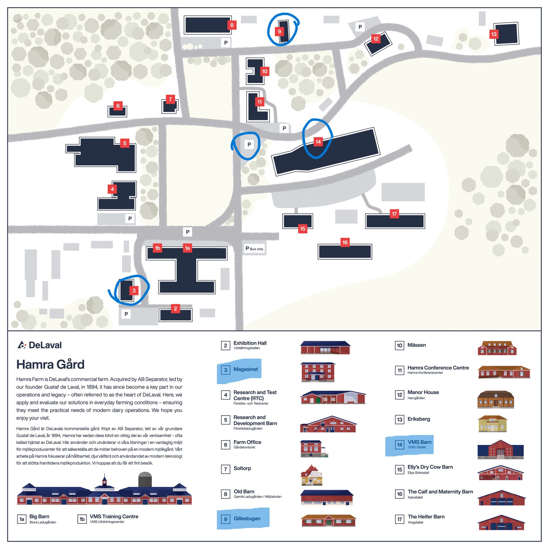 • Tag gångbron över järnvägsspåren och du ser DeLavals huvudkontor på din högersida. Fortsätt rakt fram i 600m till Hamra Gård